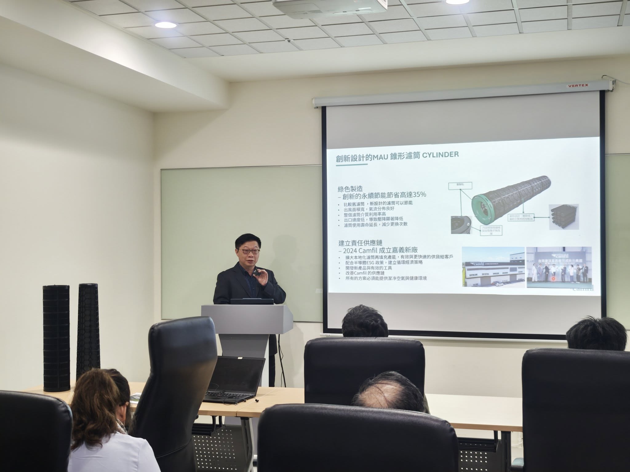 XG創新錐形化學濾筒較傳統圓柱形濾筒,節能效能按某先進半導體廠每廠約30台MAU 評估,更換新濾筒後每台MAU 一年可省電 28,388 度,一年每廠可節約電費 NTD 356 萬,排碳量減少403,677公斤,約等於每年植樹 53,823 棵。